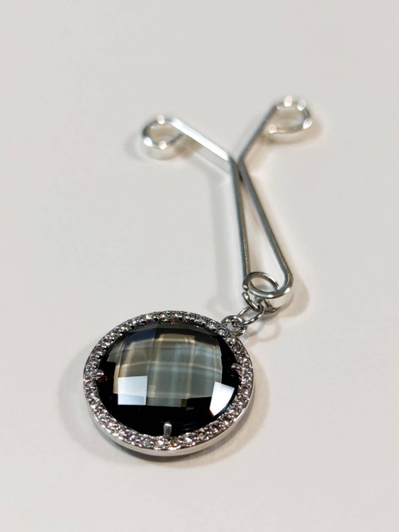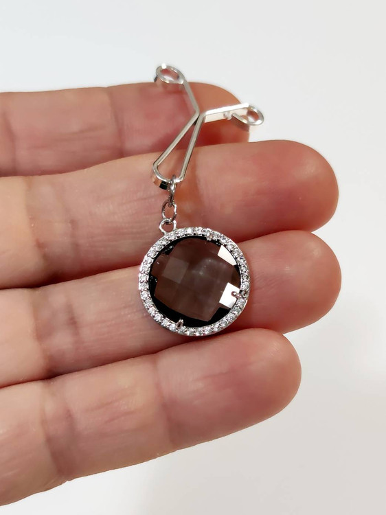 گیره روسری کدG001 با نگین کریستال دایره دور نگین (رنگ ثابت) به رنگ دودی شفاف گیره درجه یک ( روسری رو نخ کش نمیکنه) و اگر ازش خوب مراقبت کنید تغییر رنگ نمیده و مدت زیادی براتون کار میکنه