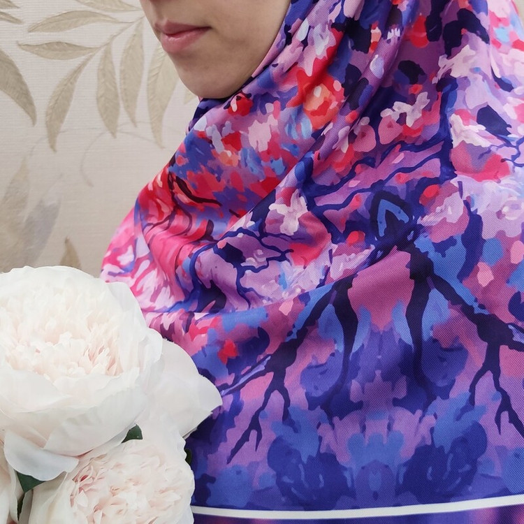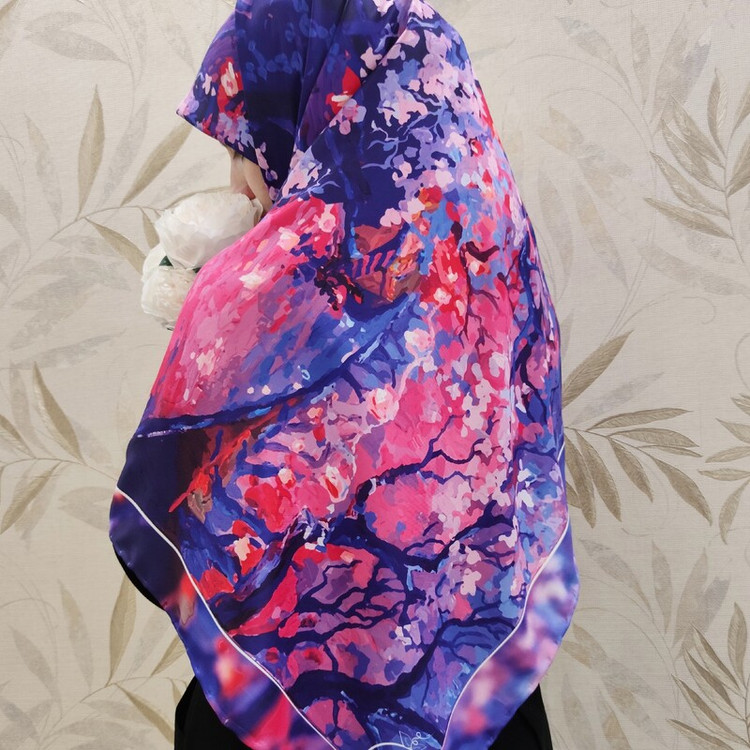 روسری ابریشم توییل نرم و لطیف با سرخوری شیک و زیبا زیر چادر سر نمیخوره و ایستاییش عالیه قواره حدود ۱۳۵ سانت