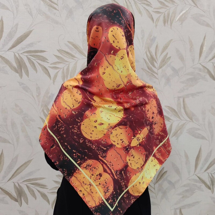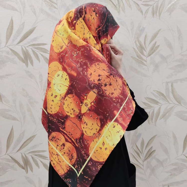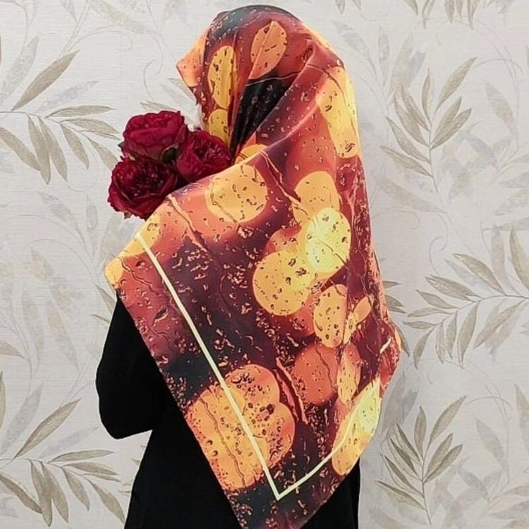 روسری ابریشم توییل نرم و لطیف با سرخوری شیک و زیبا زیر چادر سر نمیخوره و ایستاییش عالیه قواره حدود ۱۳۵ سانت