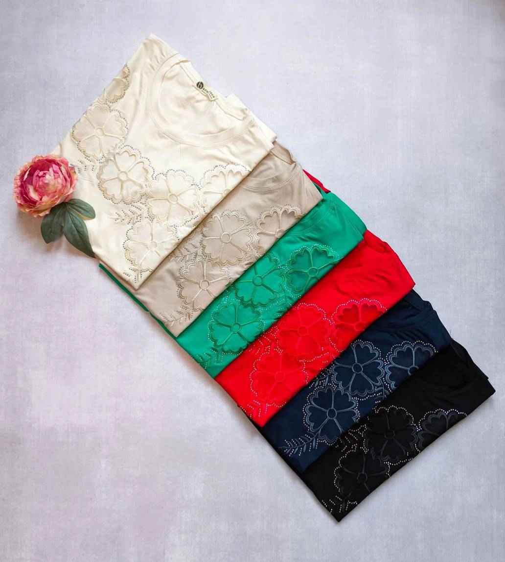 تیشرت گلدوزی جنس 👈 ویسکوز وارداتی، با کیفیت و با دوام، لطیف و راحت. دارای ۶ رنگ زیبا سایز بندی 👈 فری سایز قواره دار جزییات 👈 آستین کوتاه، یقه گرد، گلدوزی و تور در قسمت سینه