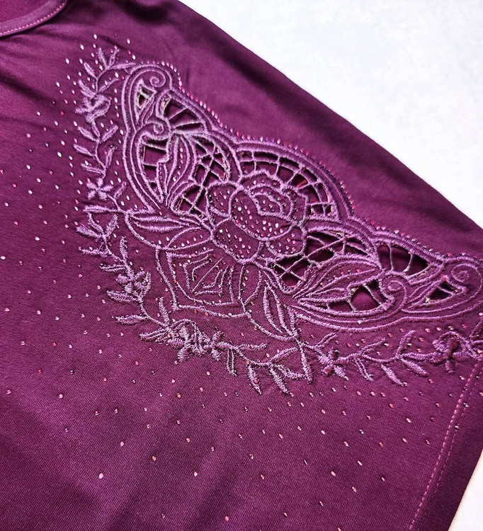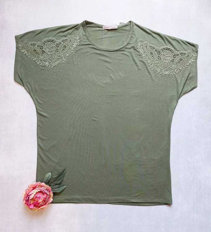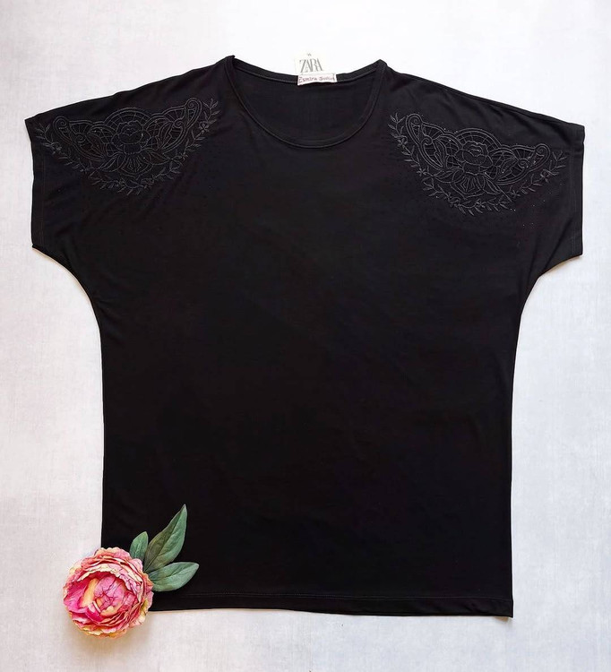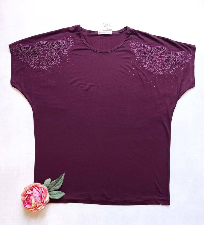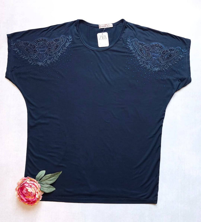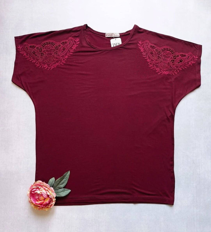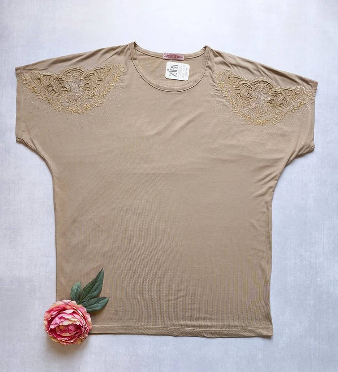 تیشرت گلدوزی جنس 👈 ویسکوز وارداتی، با کیفیت و با دوام، لطیف و راحت. دارای ۶ رنگ زیبا سایز بندی 👈 فری سایز قواره دار جزییات 👈 آستین کوتاه، یقه گرد، گلدوزی و تور در قسمت سینه
