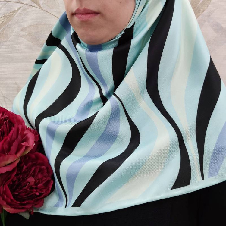 روسری ابریشم توییل نرم و لطیف با سرخوری شیک و زیبا زیر چادر سر نمیخوره و ایستاییش عالیه قواره حدود ۱۳۵ سانت